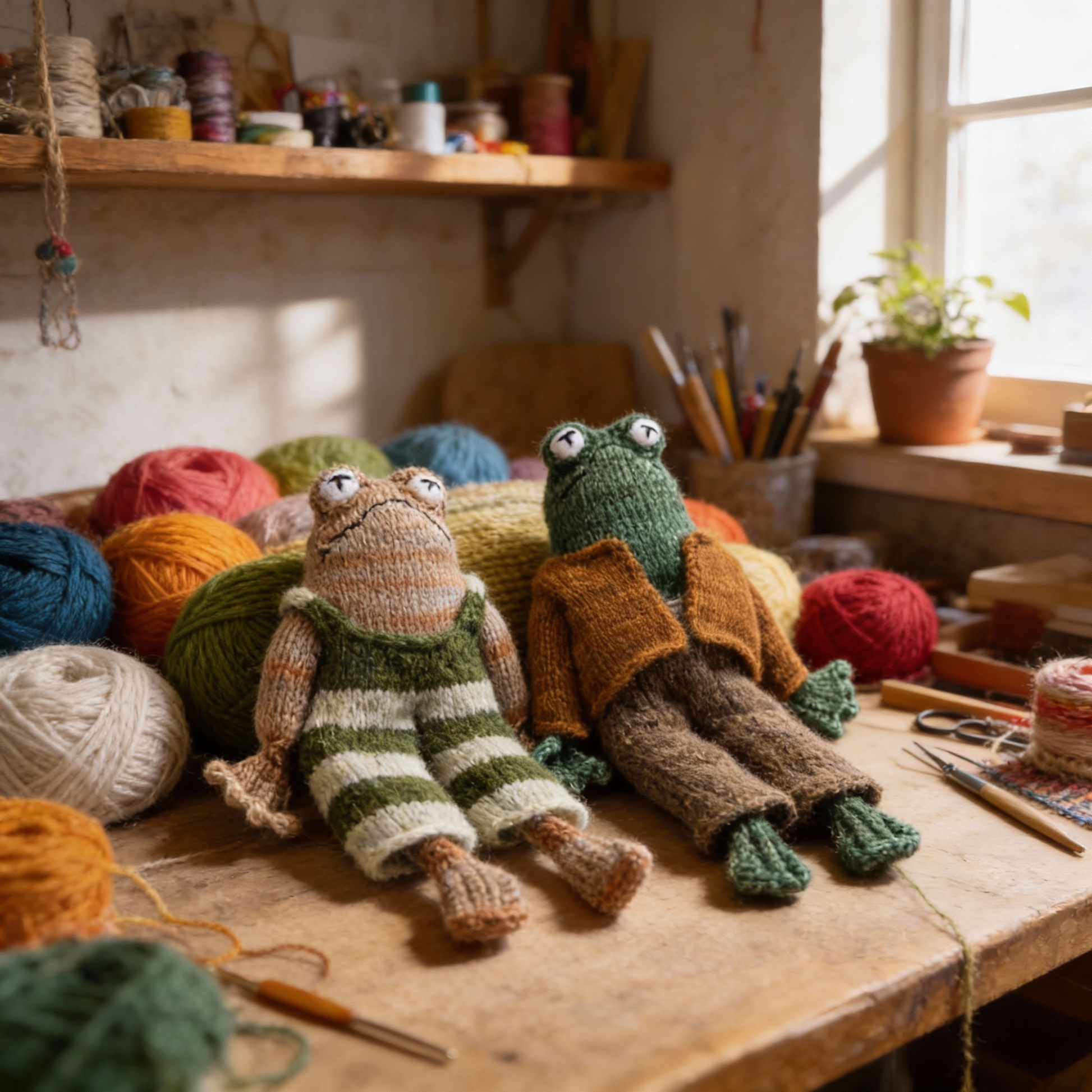 Based on the beloved characters from Frog and Toad Are Friends, this beautifully hand-knitted pair captures everything we love about their world: gentle humour, patience, kindness, and the joy of simple companionship. Frog is optimistic and encouraging, always ready with a plan or a reassuring word. Toad is cautious and earnest, sometimes doubtful, but endlessly sincere — and all the braver for it.