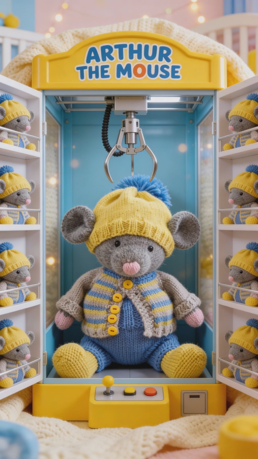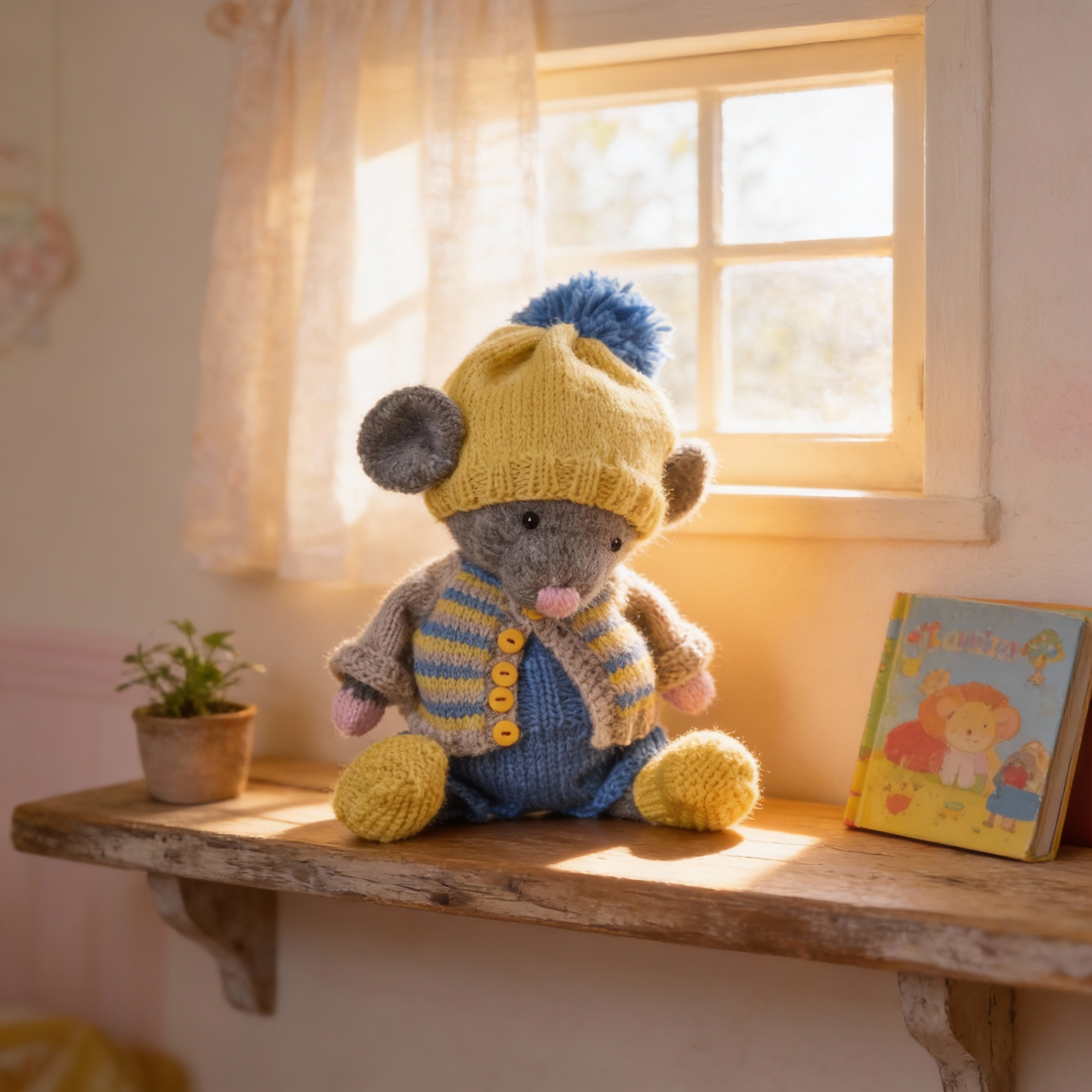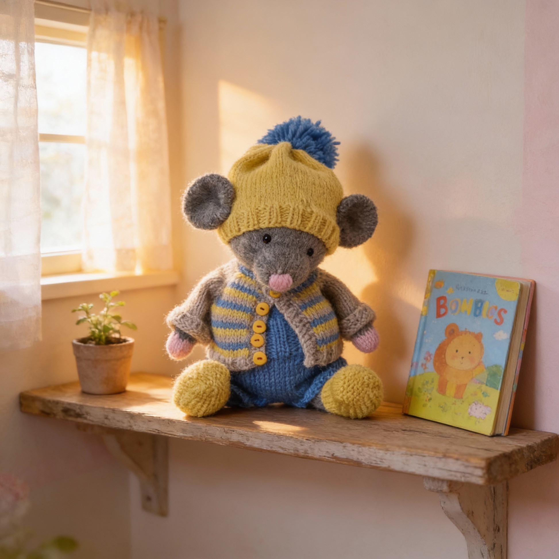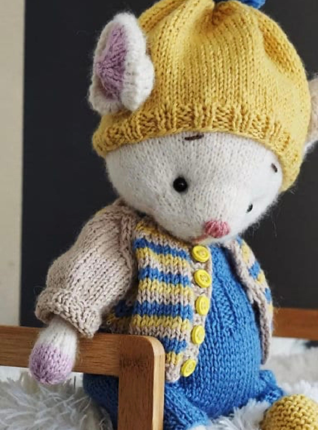 Hand knitted from the original Polushka Bunny pattern, Arthur is beautifully detailed and full of charm. You can choose your mouse in grey or white, and he comes complete with his own outfit: overalls, cardigan, hat, and boots in cheerful blue and yellow tones. His clothes can be customised by colour on request, and an embroidered initial can be added to his overalls for a truly personal touch.