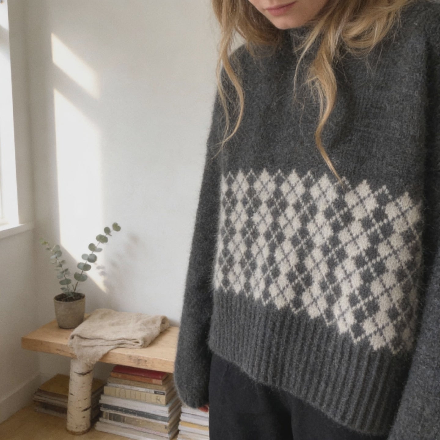 A deep ribbed hem gives the sweater structure and balance, while the elegant chequered pattern across the body adds quiet interest and artisanal detail. Relaxed yet refined, it pairs effortlessly with everything from tailored trousers to flowing skirts, making it a true wardrobe staple.